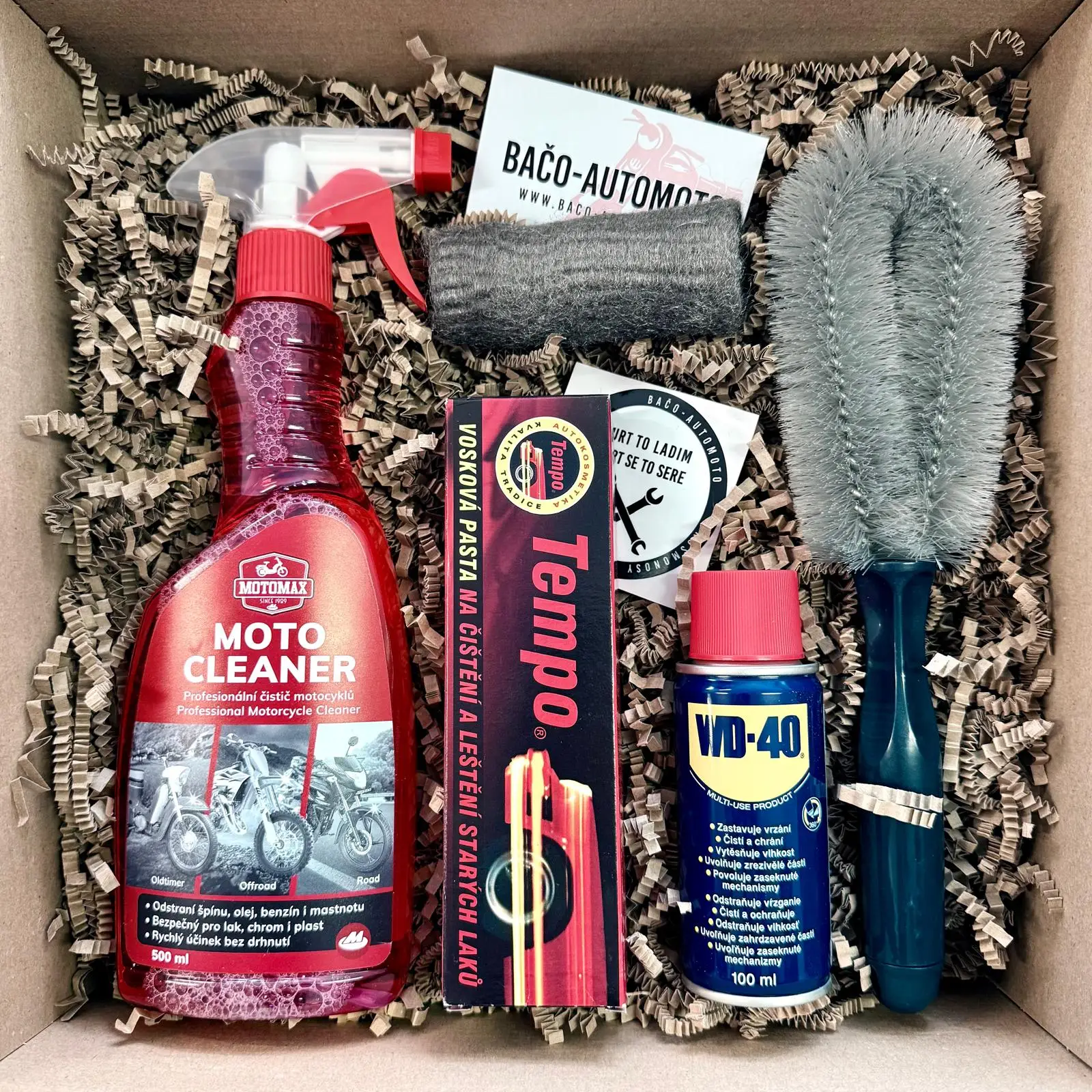 • Obsahuje: Moto cleaner Motomax, Ocelová vlna, WD-40, Tempo, Kartáč, Samolepka Bačo-automoto