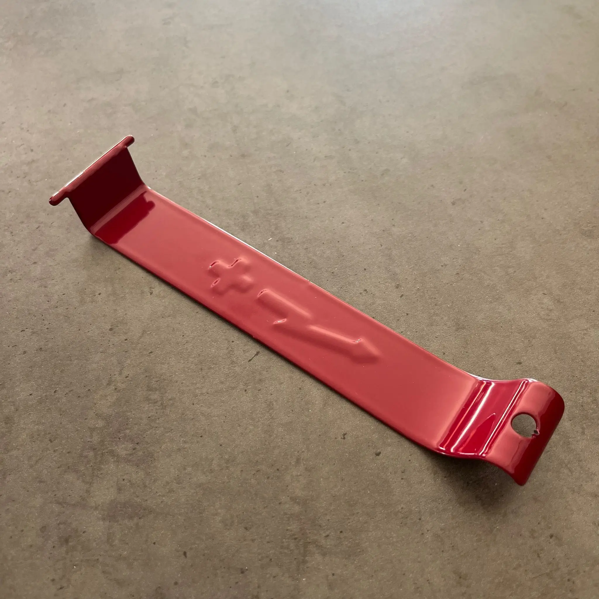 Držák baterie s označením PLUS na motocykl Jawa. Díl je opatřen červeným lakem, který zajišťuje ochranu před vnějšími vlivy a korozí. Držák je vyroben z kvalitního plechu v České republice.