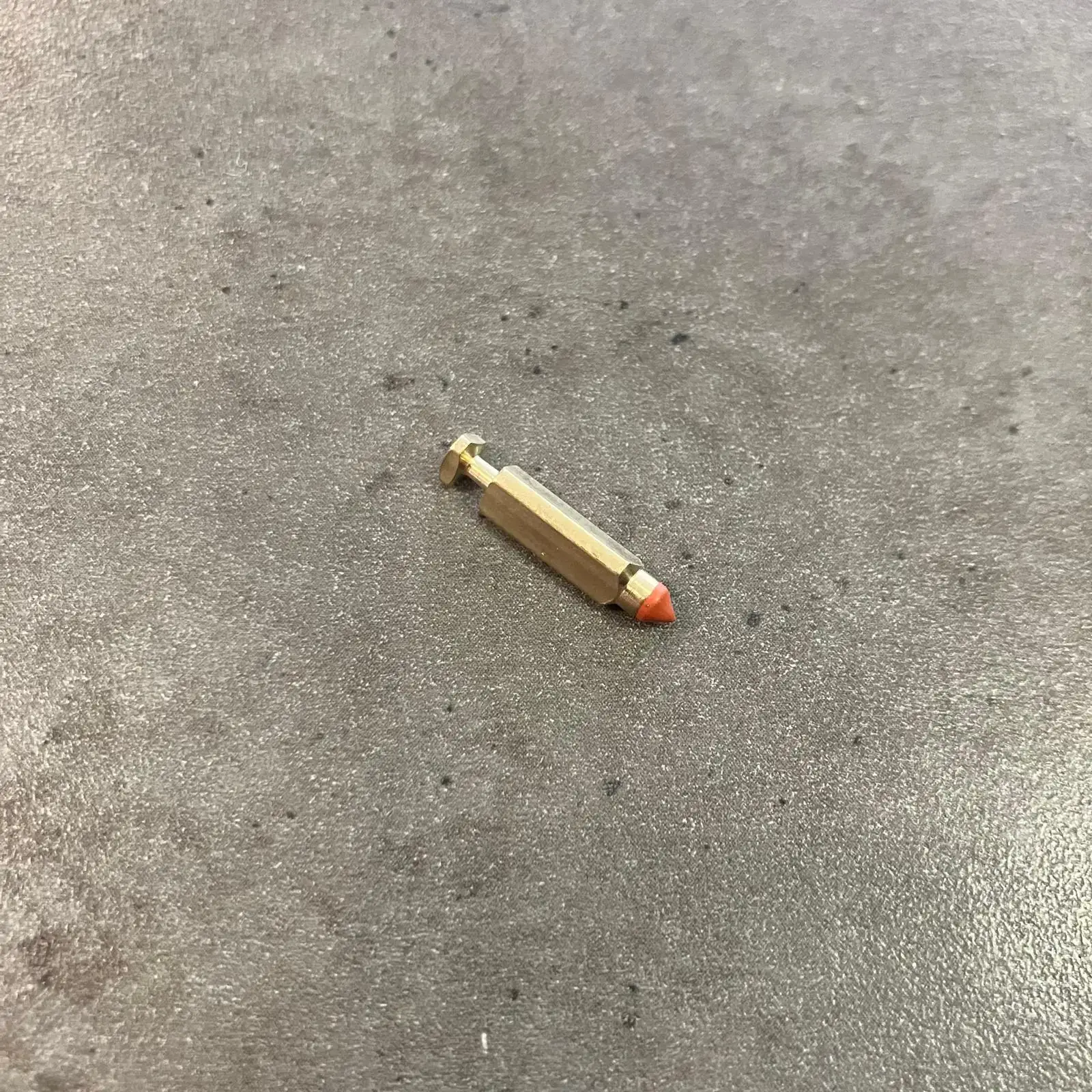 Jehlový ventil pro Babettu na karburátor značky DELLORTO. Tento důležitý komponent je pečlivě našroubován na spodní stranu víčka plovákové komory, kde zajišťuje spolehlivé uzavření přívodu benzínu.
