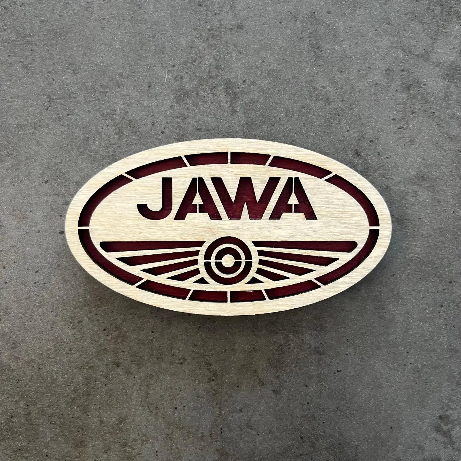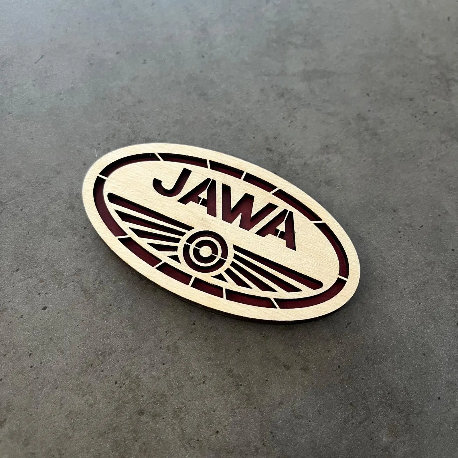 Ručně vyrobený ozdobný magnet JAWA z překližky – limitovaná licencovaná edice pro všechny milovníky legendárních motocyklů JAWA.