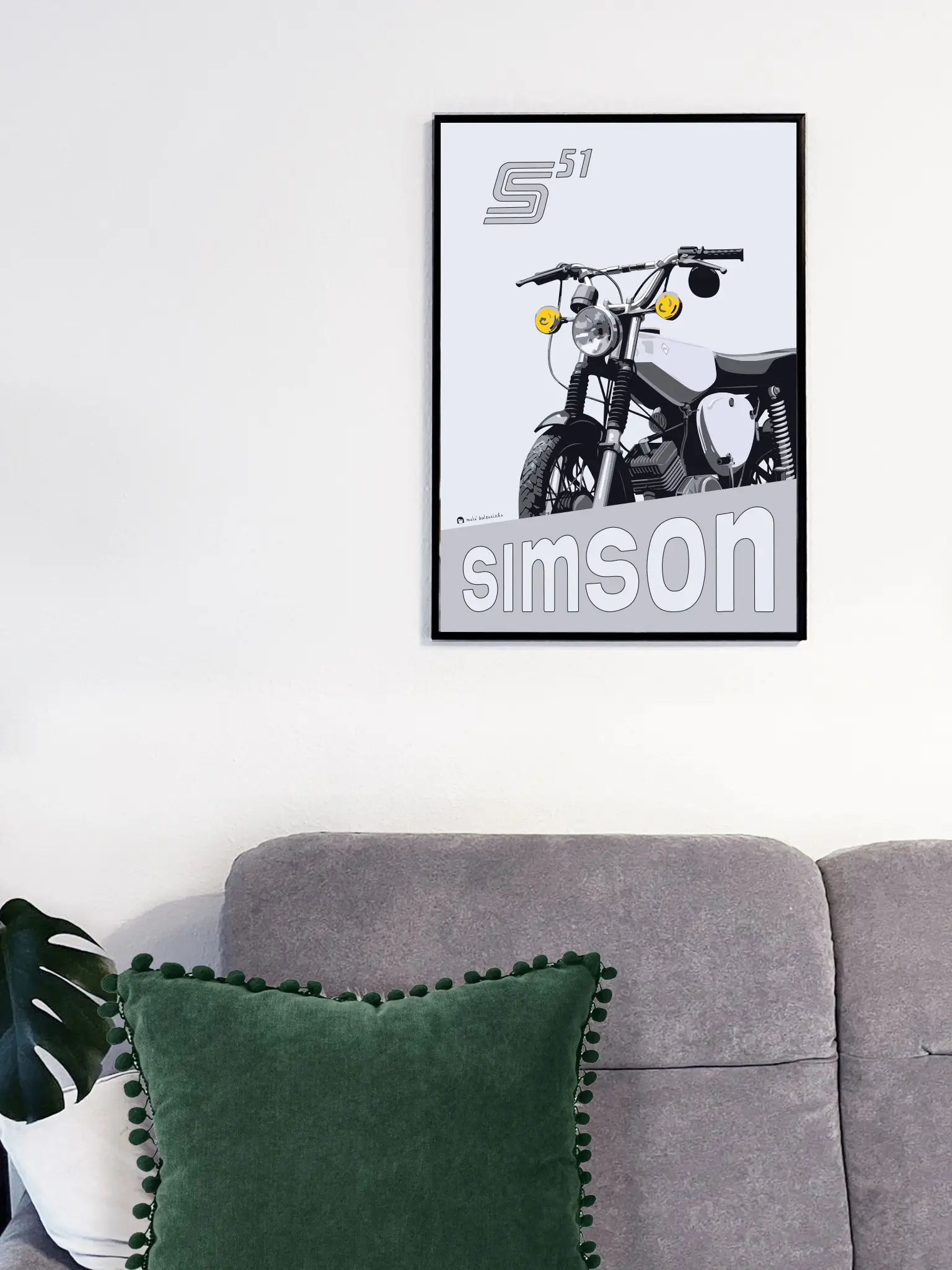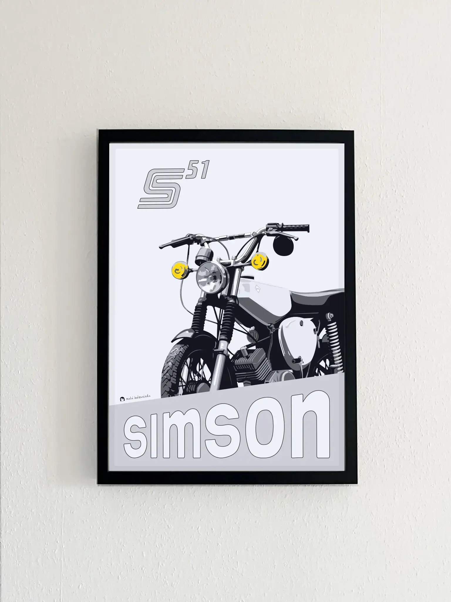 Představte si, jaký dojem by udělal tento nádherný MOTOPLAKÁT – STŘÍBRNÝ SIMSON na stěně vaší dílny, bytu nebo kanceláře. Tento výjimečný produkt není jen obyčejným plakátem, je to kousek historie a vášeň pro motocykly zachycená v umělecké podobě. Plakát vznikl v autorské dílně Malá bulgarinka v rámci projektu Motoplakáty.