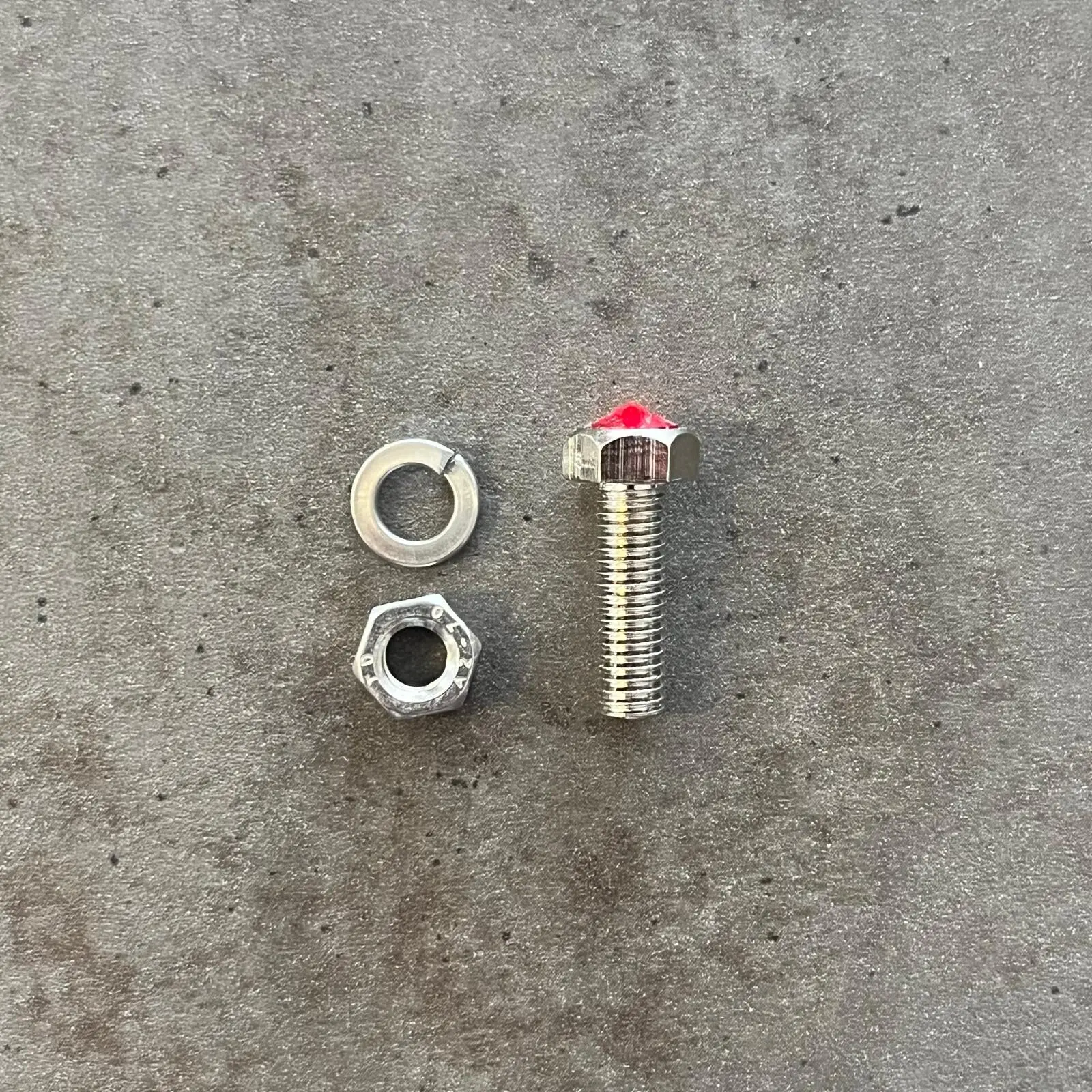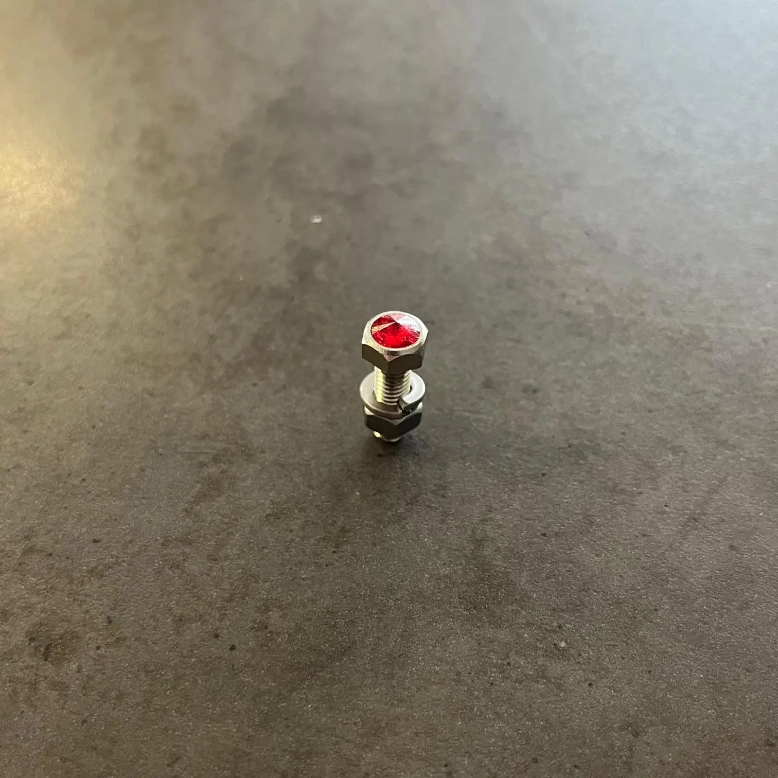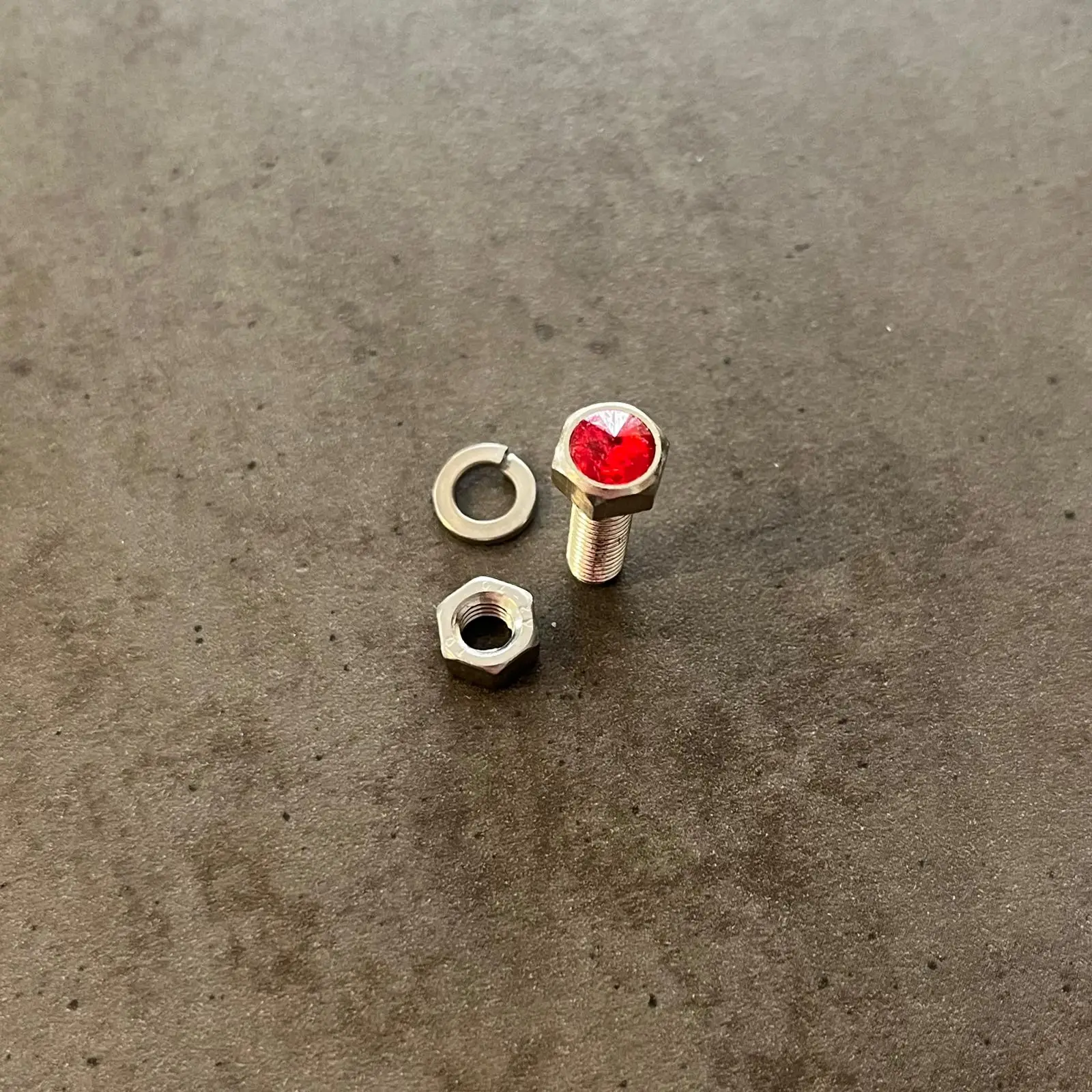 Ozdobný šroub na SPZ s červeným lesklým kamínkem. Velikost šroubu je M5 x 16. Na SPZ jsou potřeba 2ks šroubu.