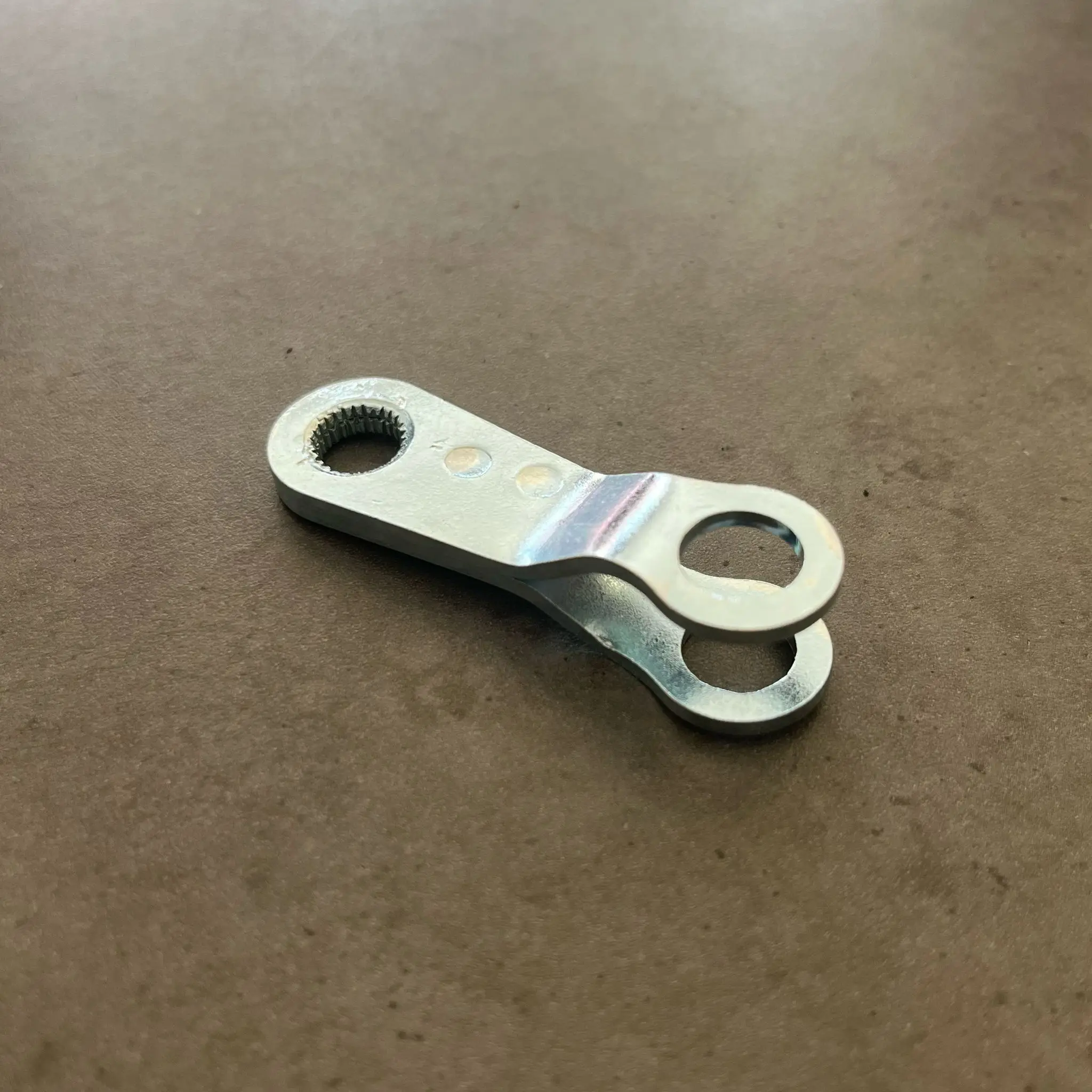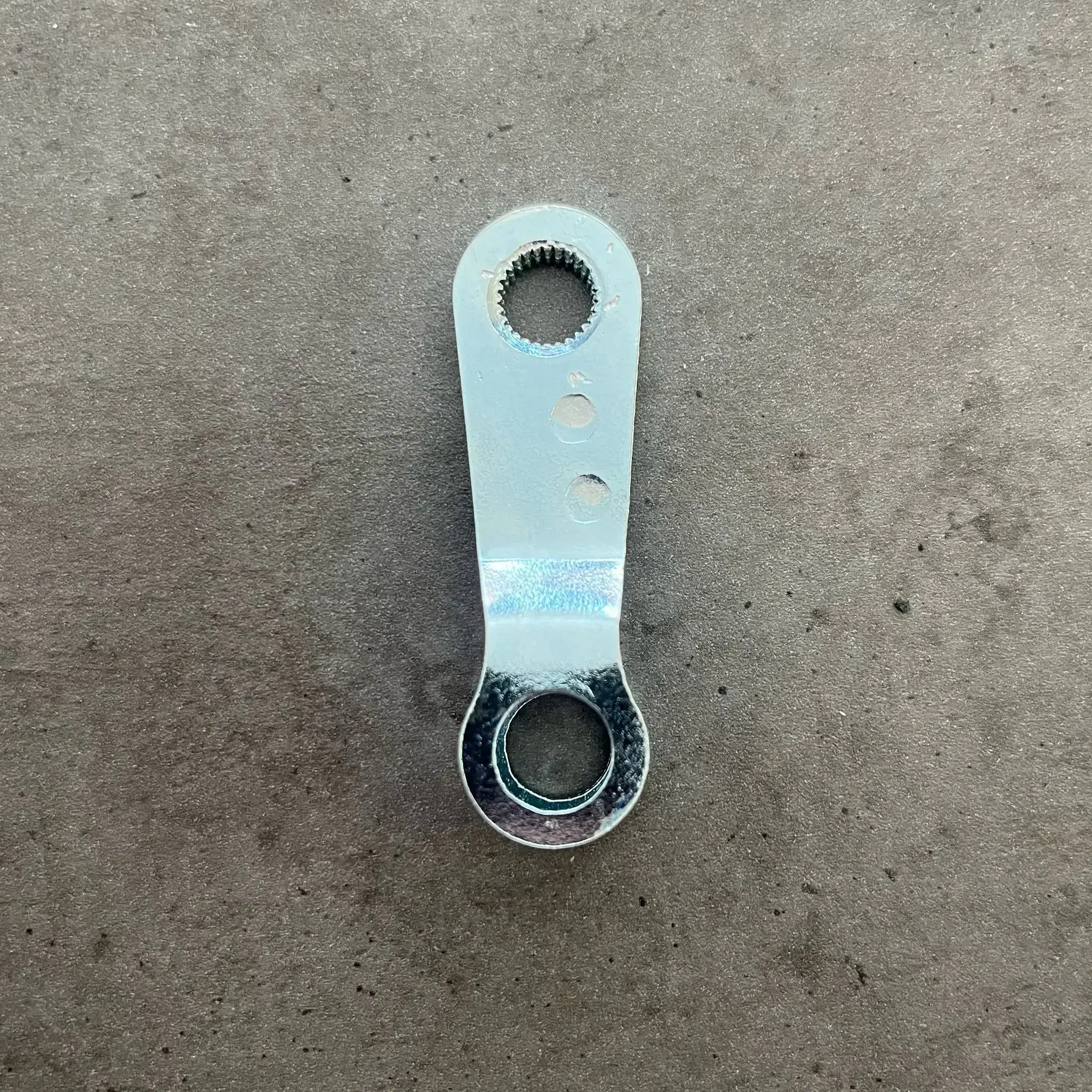 Páčka štítu brzdy na motocykl Stadion. Páčka je vhodná pro přední i zadní brzdu. Tento díl má povrch pozinkovaný, což zaručuje vyšší odolnost proti korozi a dalším vnějším vlivům.