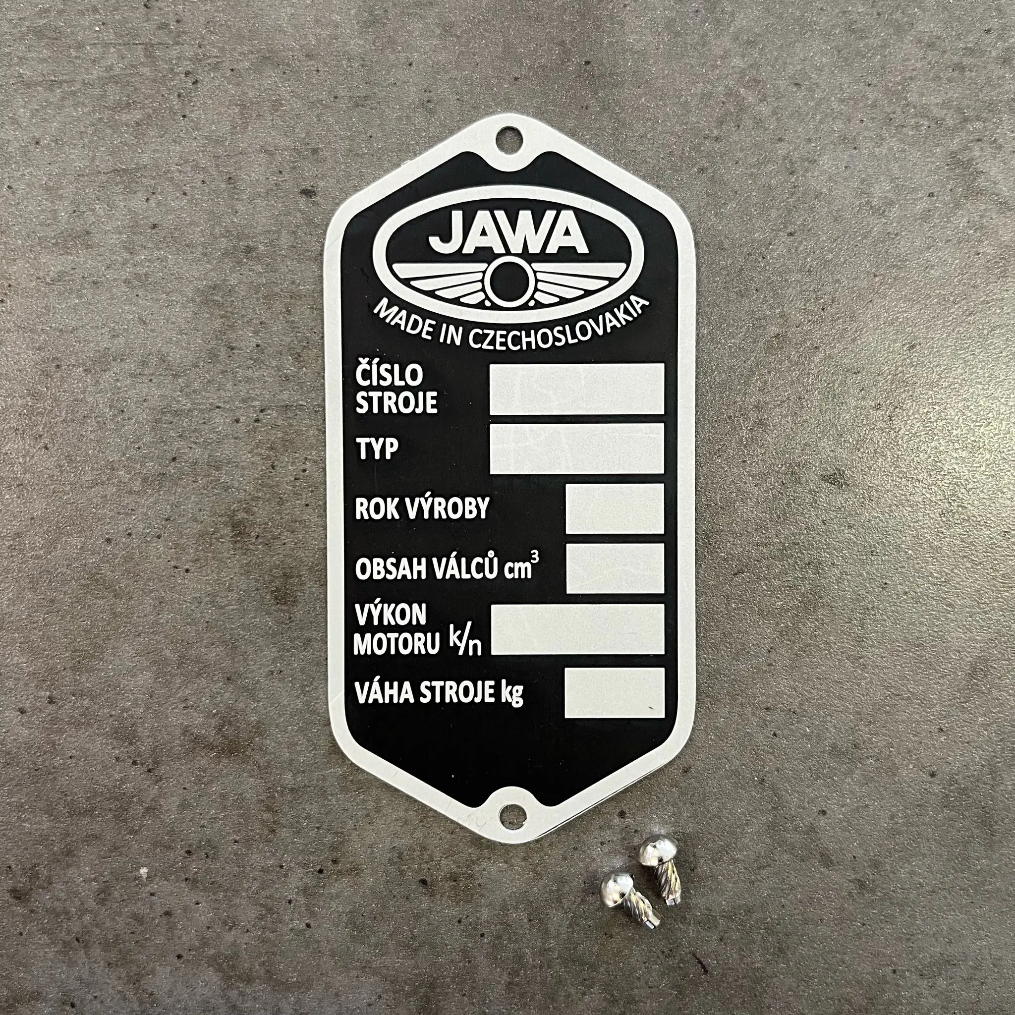 Typový štítek s označením JAWA pro motocykly Jawa – precizní replika originálního štítku. Tento tištěný štítek je vyroben s maximální péčí a pozorností k detailům. Obsahuje přesné otvory pro nýtování a je dokonale vycentrovaný vůči okrajům.